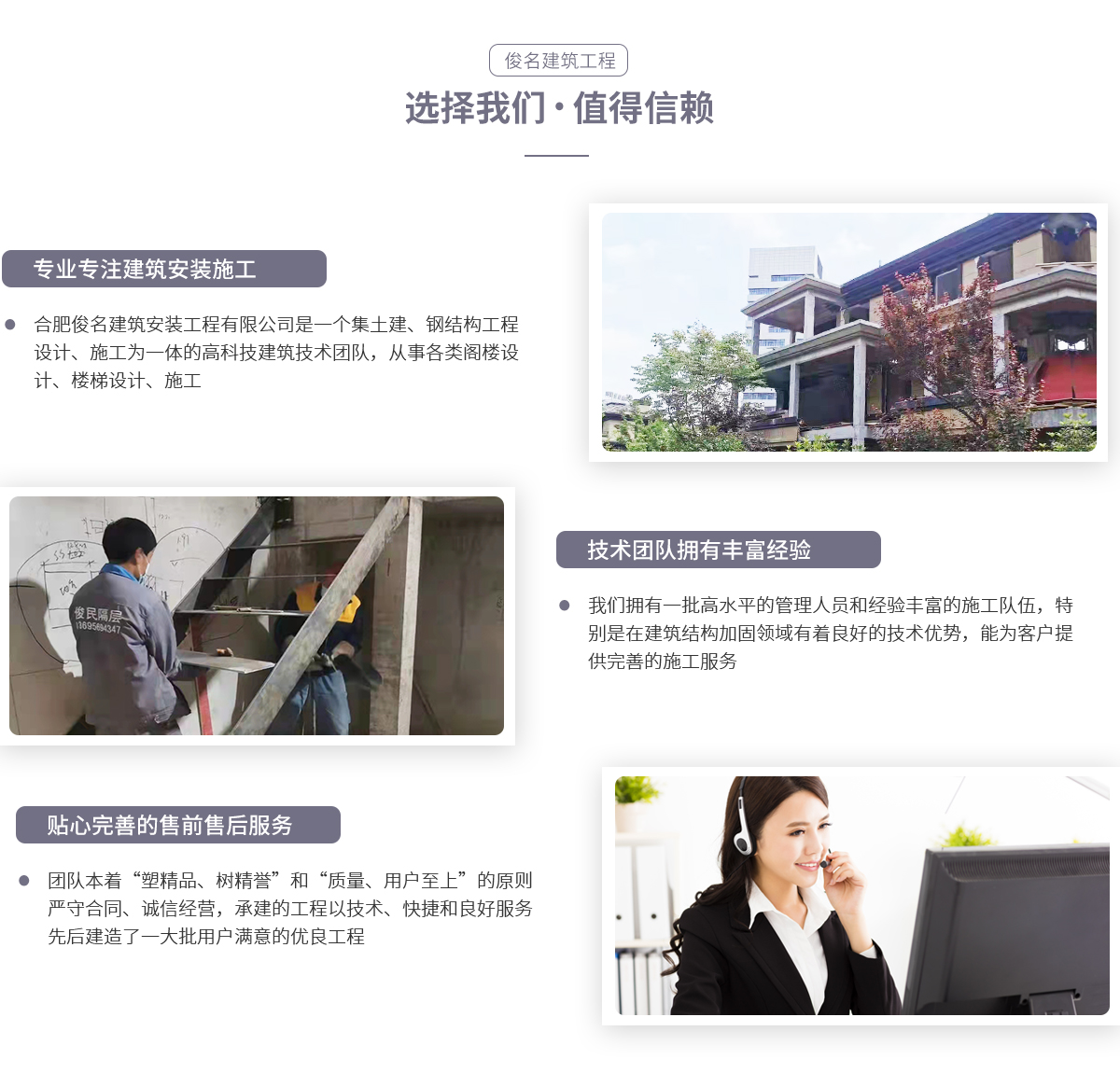 合肥俊名建筑安装工程有限公司是一个集土建、钢结构工程设计、施工为一体的高科技建筑技术团队,从事各类阁楼设计、施工。我们拥有一批高水平的管理人员和经验丰富的施工队伍,特别是在建筑结构加固领域有着良好的技术优势。团队员工精诚团结,以“尊重规范,拒绝平凡”为宗旨,为客户提供完善的施工服务。团队本着“塑精品、树精誉”和“质量、用户至上”的原则,严守合同、诚信经营,所...
